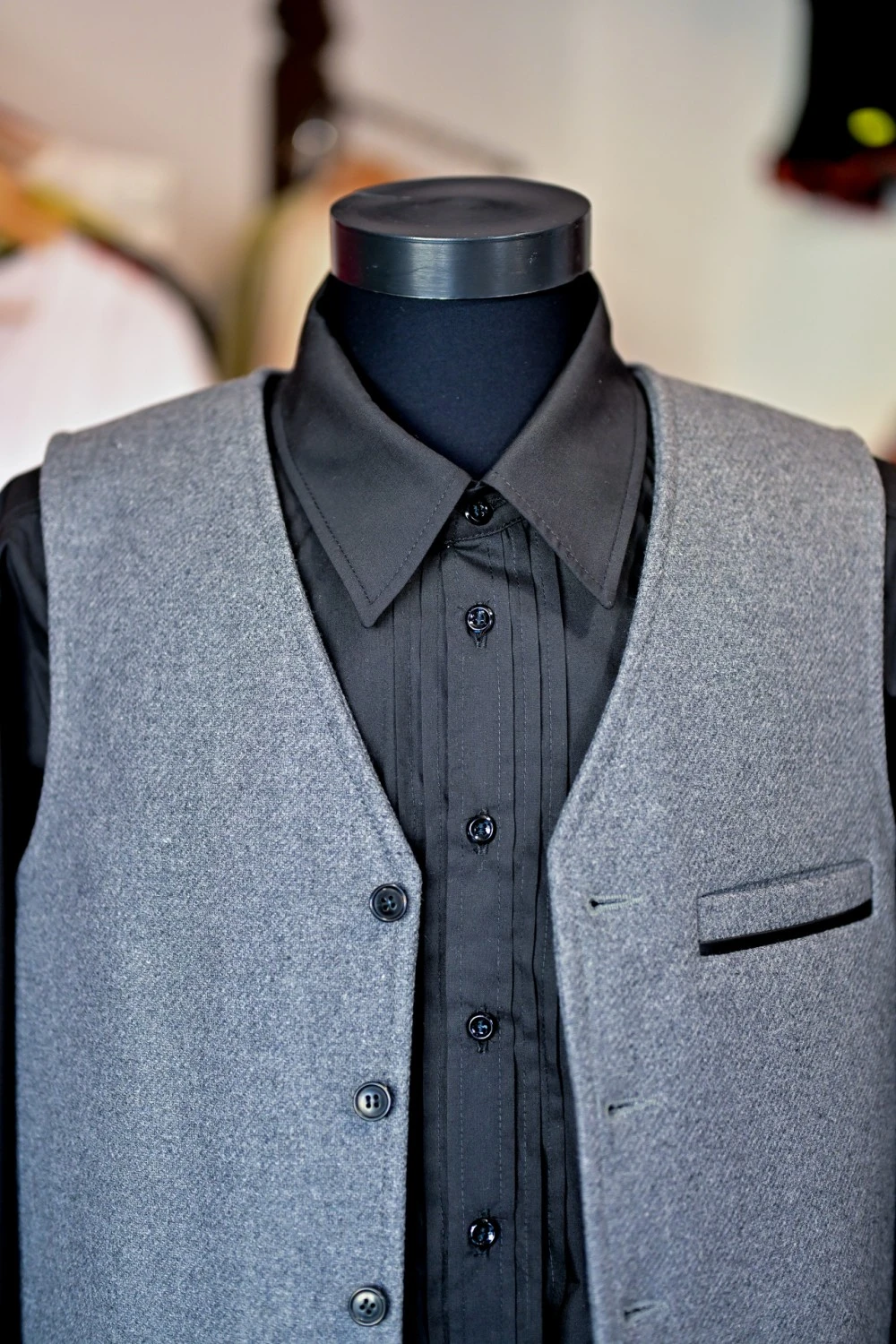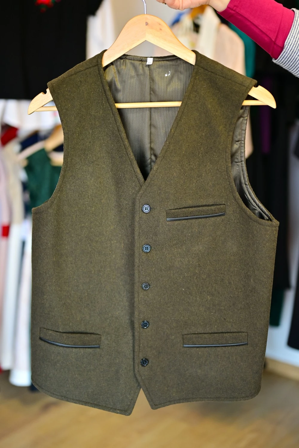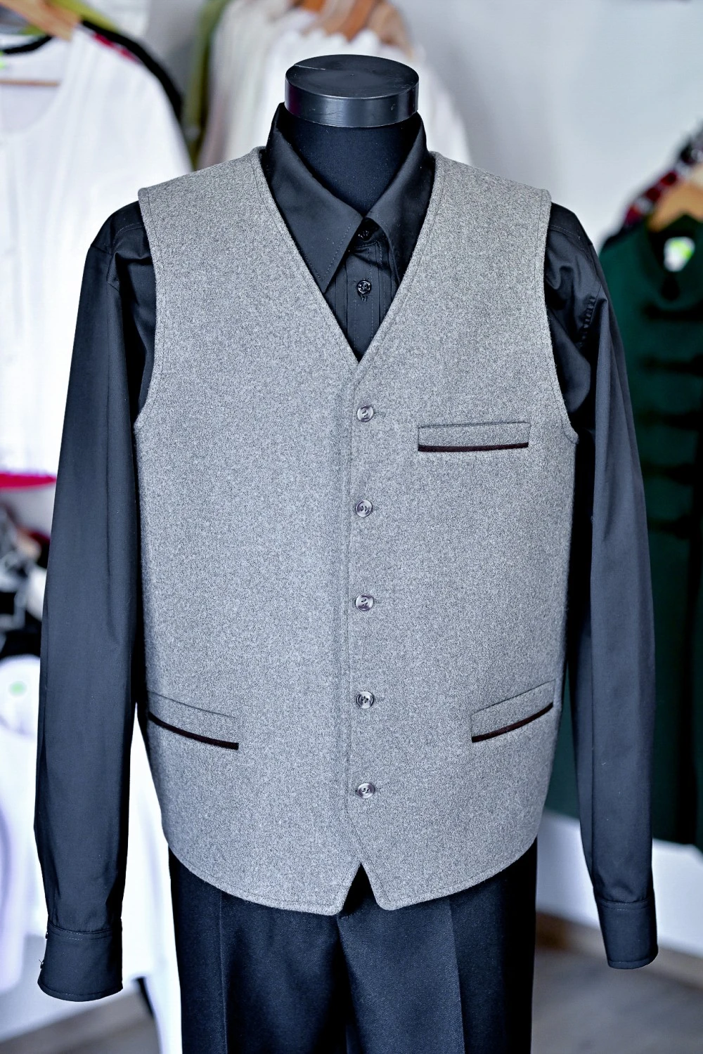 Elegáns, tartós gyapjú posztó mellény letisztult vonalvezetéssel és minőségi bőr paszpollal a zsebeknél — tökéletes választás hidegebb napokra, városi és ünnepi viselethez egyaránt.
