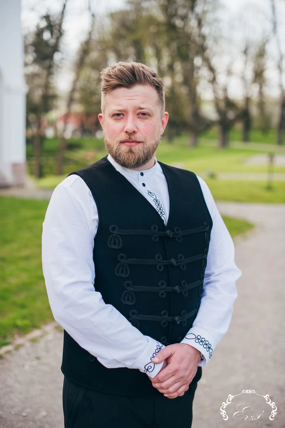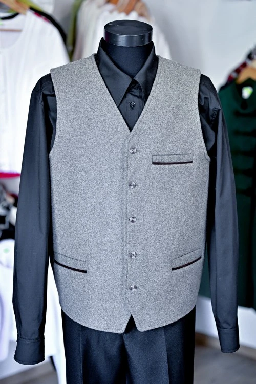A meleg gyapjúposztóból készült, tökmintás zsinóros férfi mellény elegáns fekete nadrággal, de hétköznapokon akár egy farmernadrággal és inggel is hordható.