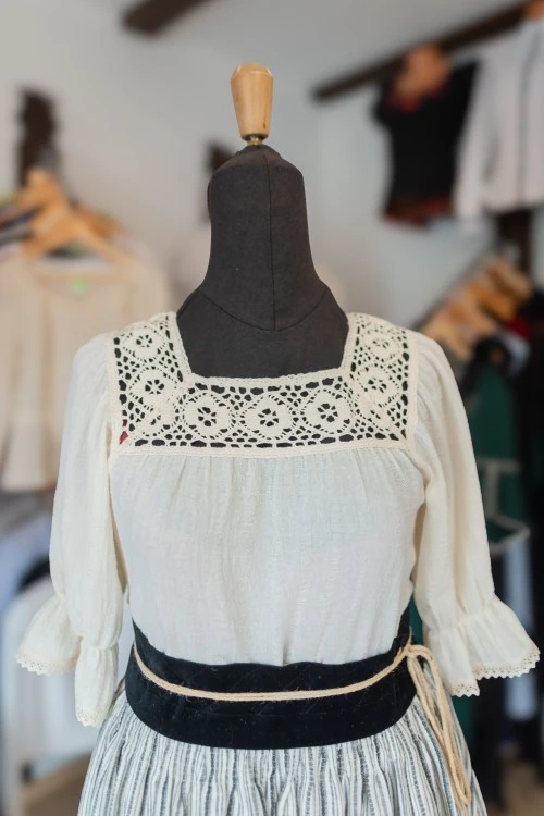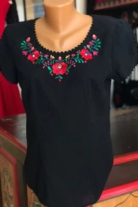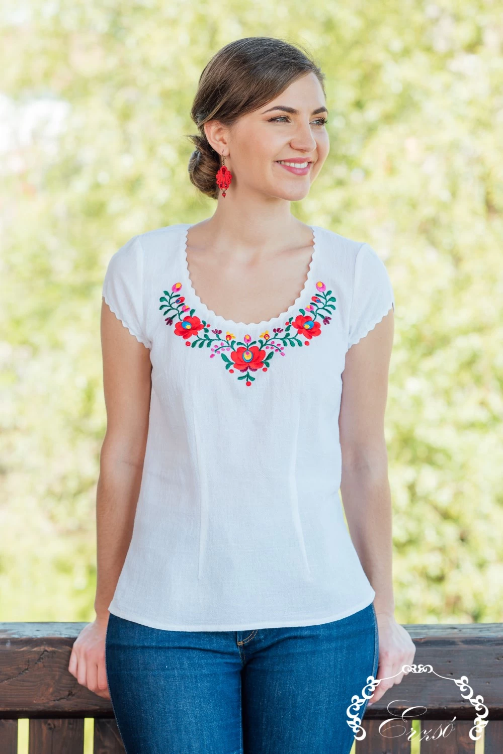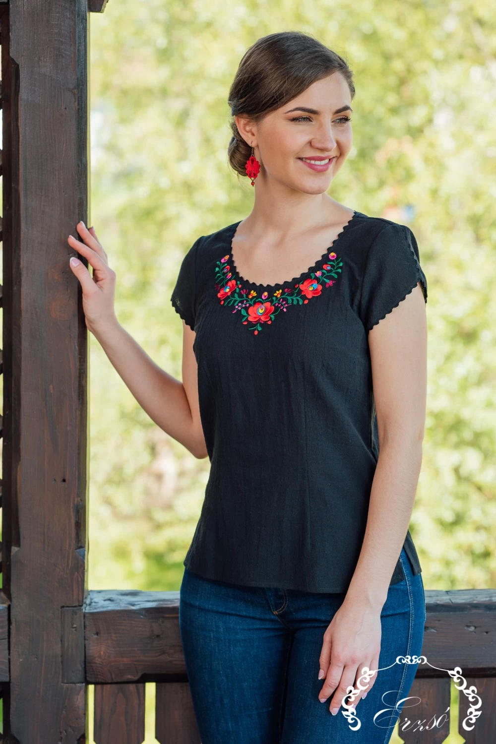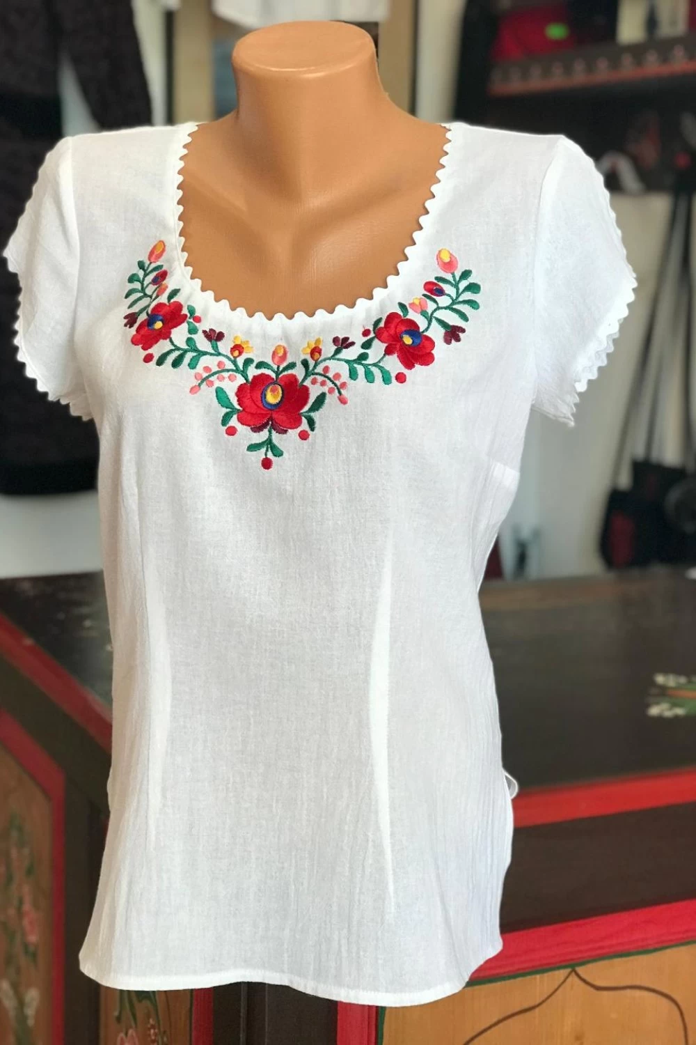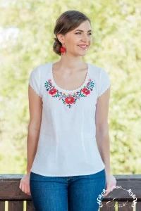 Ez a vidám matyó hímzéssel készült blúz pamutvászon alapú. Szabását tekintve lezser, enyhén karcsúsított, tökéletesen illik rá a mondás, hogy "ápol és eltakar".