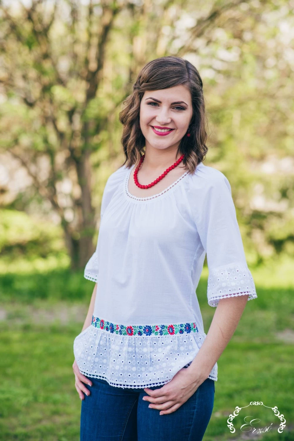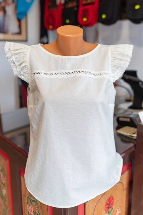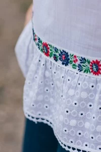 A Veronika blúz 100%-ban természetes anyagból készült, így kellemes viselet akár a hétköznapokban is farmernadrággal társítva. A madeira anyagrészlet és a magyaros díszítőszalag kombinációja teszi igazán "Erzsóssá" és egyedivé.