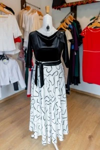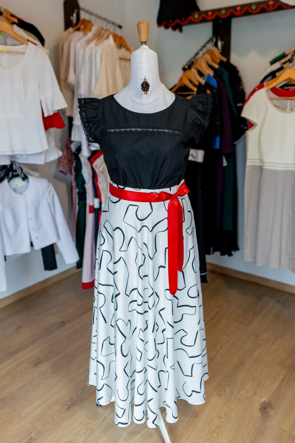 A piros szalaggal díszített változat egy könnyed, mégis karakteres összeállítás. A fekete rövidujjú felső csipkés részletei játékosan hangsúlyozzák a nőiességet, miközben a kontrasztos színek és a bő szabás lendületet visznek a megjelenésbe. Ez az összeállítás ideális választás lehet egy nyári eseményre, kulturális programra vagy akár egy különleges hétköznapra is.