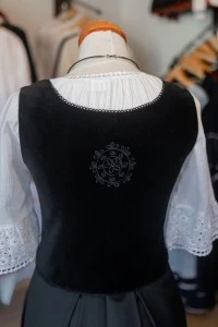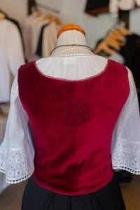 Ez a különleges kalotaszegi mellény puha pamutbársonyból készült, és finom hímzései a térség gazdag népművészeti hagyományait idézik. A klasszikus elől fűzős szabás kiemeli az alakot, miközben kényelmes viseletet biztosít. Egyedi darab, amely ünnepi alkalmakra, hagyományőrző rendezvényekre, de akár modern összeállításokhoz is különleges választás.
