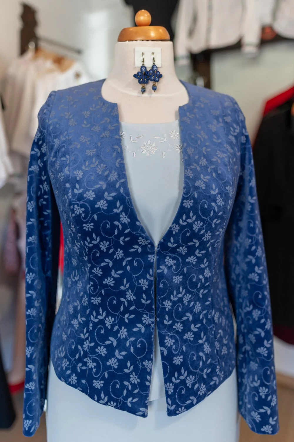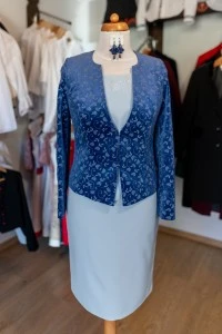 A Renáta kosztüm egy letisztult, mégis különleges viselet, amely a minőségi pamutbársonyból készült zakóval emeli ki viselőjének megjelenését. A világos színű szoknya és blúz lágy esésű anyaga komfortot biztosít, miközben a sötétkék zakó finoman kidolgozott részletei eleganciát sugallnak. A hagyományos szabásvonalakat újragondolt formában megjelenítő kosztüm tökéletes választás alkalmi eseményekre vagy ünnepélyes alkalmakra.