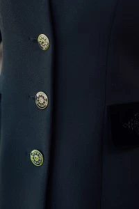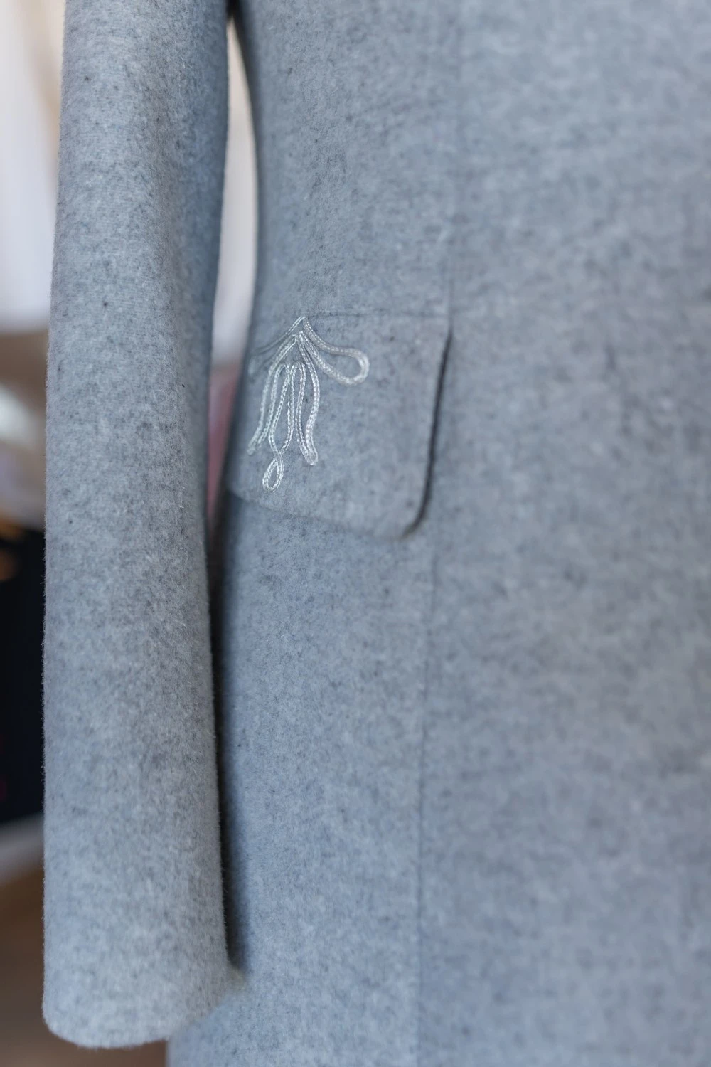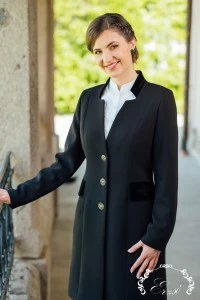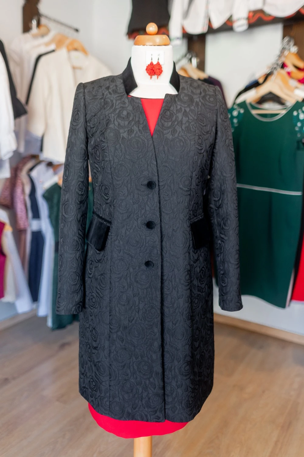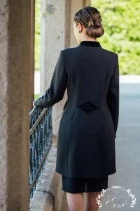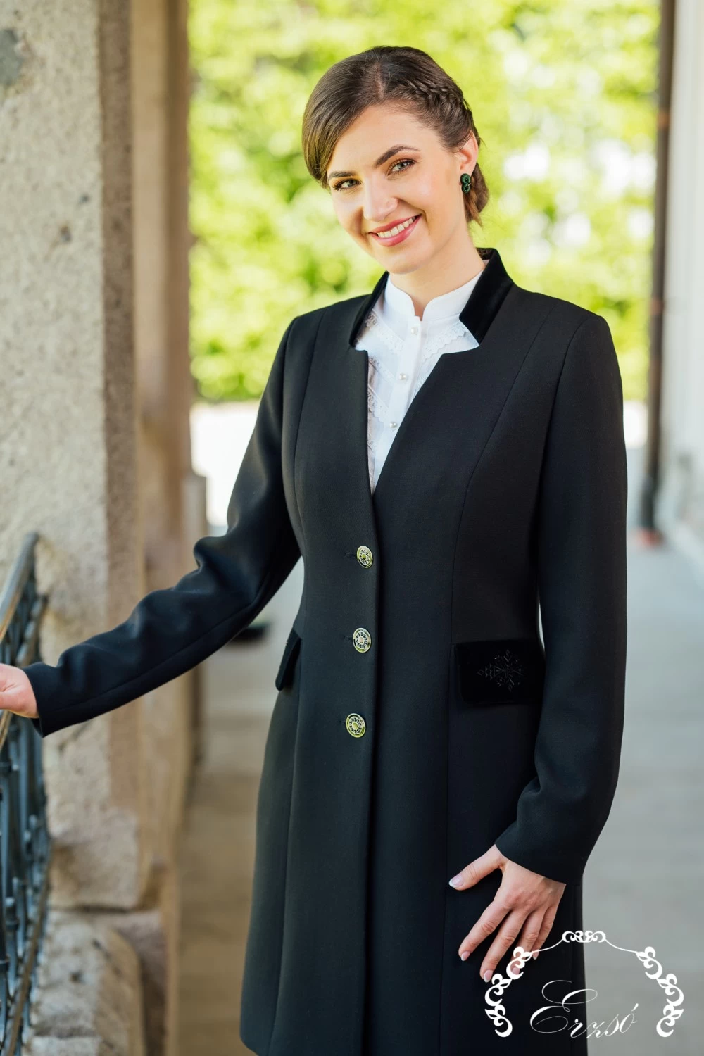 A tavaszi Emma kabátokat magas minőségű szövetből készítjük és különleges tükörbársony részletekkel kombináljuk. A zsebfedők, a gallér, illetve a kabát hátán lévő betét készül tükörbársonyból, amelyeket fekete szalmagyönggyel díszítünk.