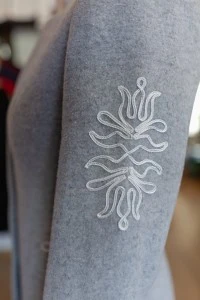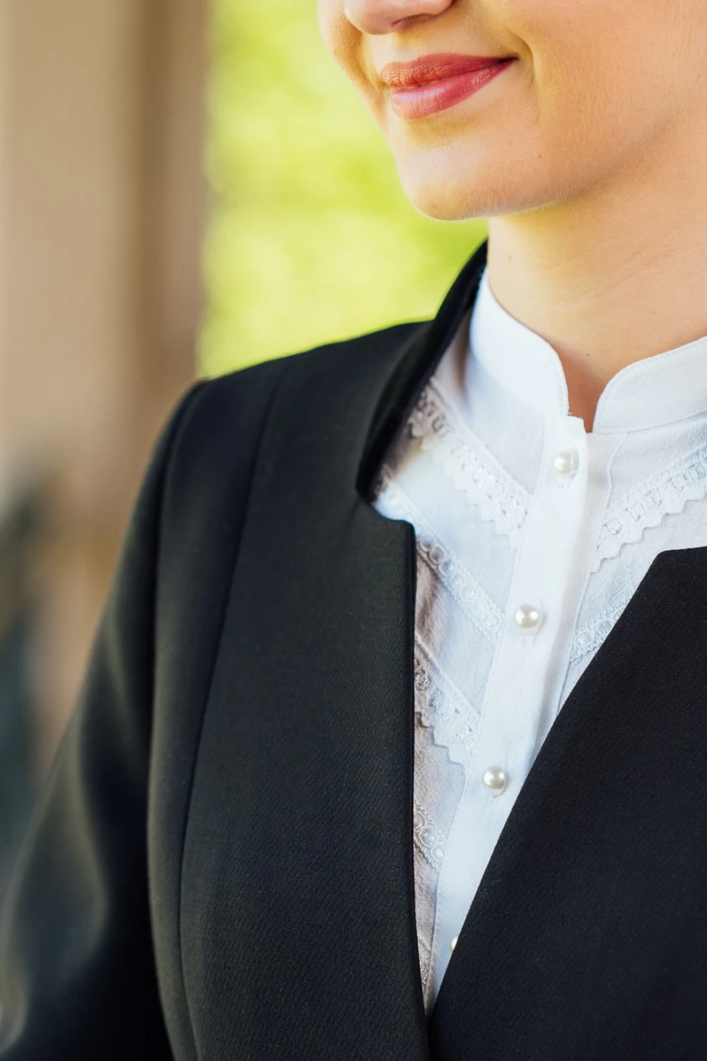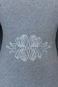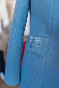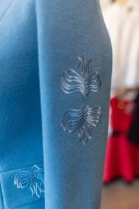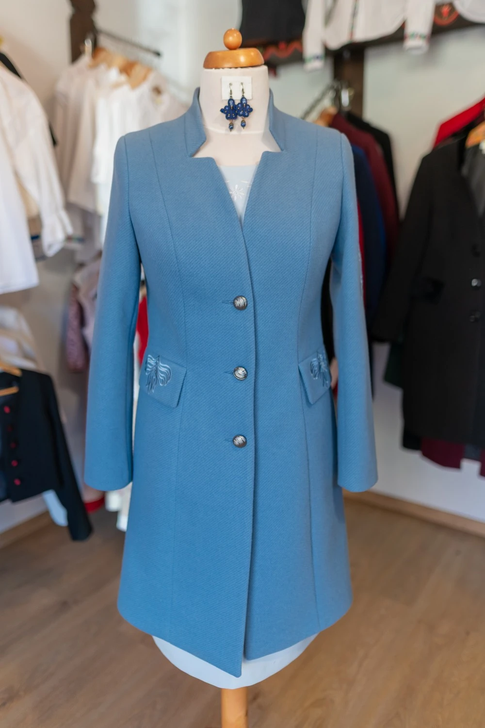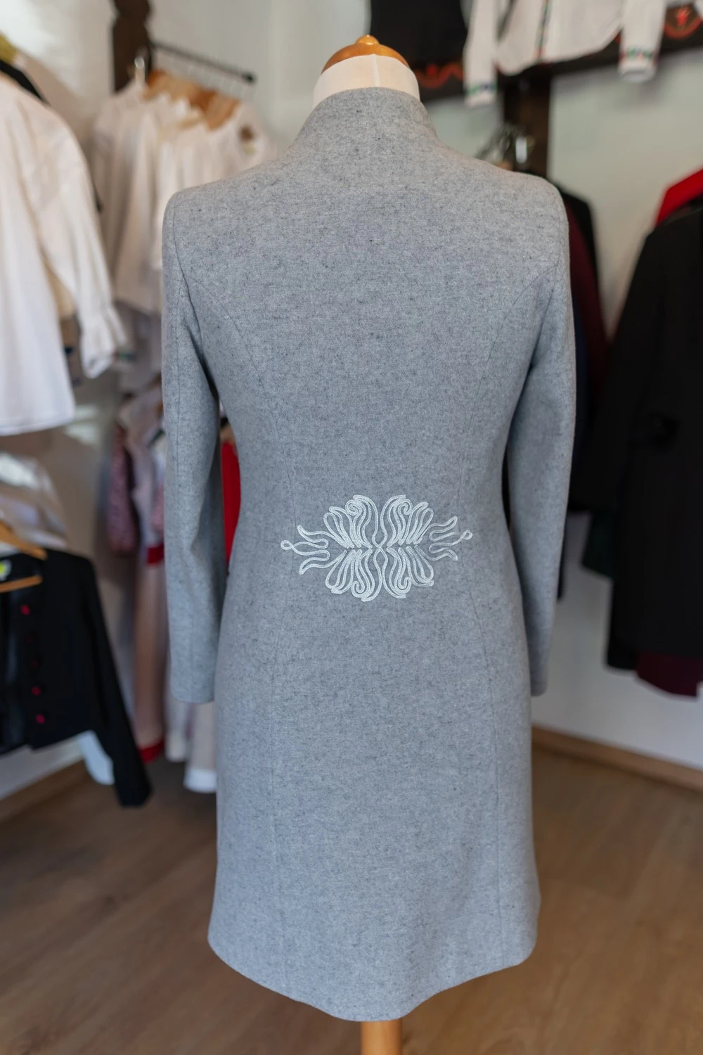 A tavaszi Emma kabátokat magas minőségű szövetből készítjük és különleges tükörbársony részletekkel kombináljuk. A zsebfedők, a gallér, illetve a kabát hátán lévő betét készül tükörbársonyból, amelyeket fekete szalmagyönggyel díszítünk.