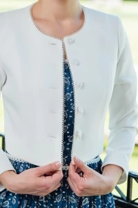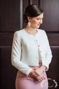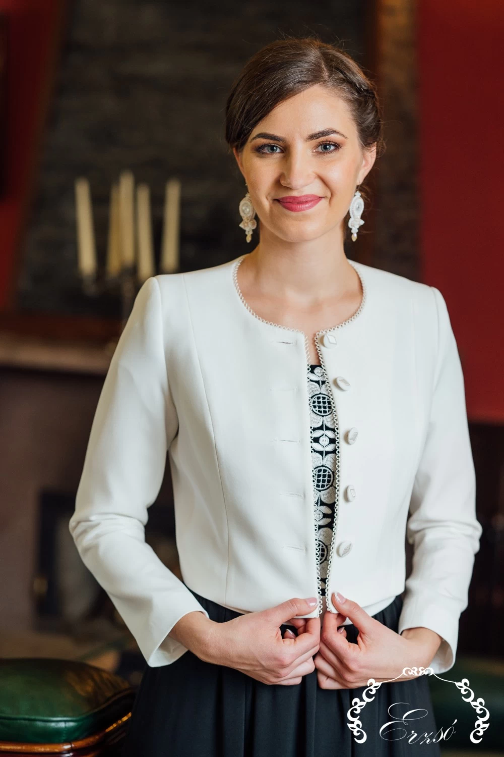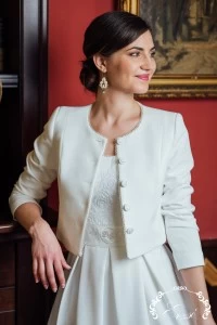 A Zsuzsika zakót eredetileg a Zsuzsika ruhához készítettük, de az Annabella ruhának is méltó társa, illetve bármilyen más, derékban elvágott ruhának jó kiegészítője. Anyaga viszkóz-poliészter keverék, mindenik évszakban hordható. Szegélyét szolid csipke dísziti, gombjait rombusz alakú hímzéssel díszítettük.