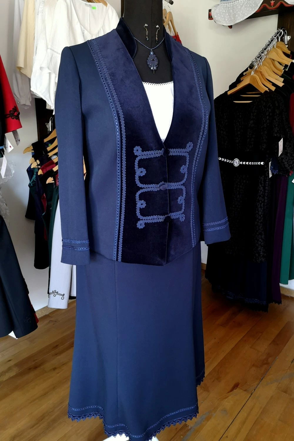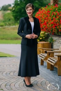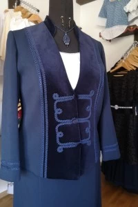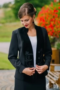 A Gizella kosztüm bársonybetétes, csinosított felsőrésze és hatba szabott, harang alakú szoknyája hangsúlyozza a nőies formákat, ugyanakkor ápol és eltakar. A felsőt és a szoknyát egyben, de más ruhadarabokkal kombinálva is hordhatjuk.