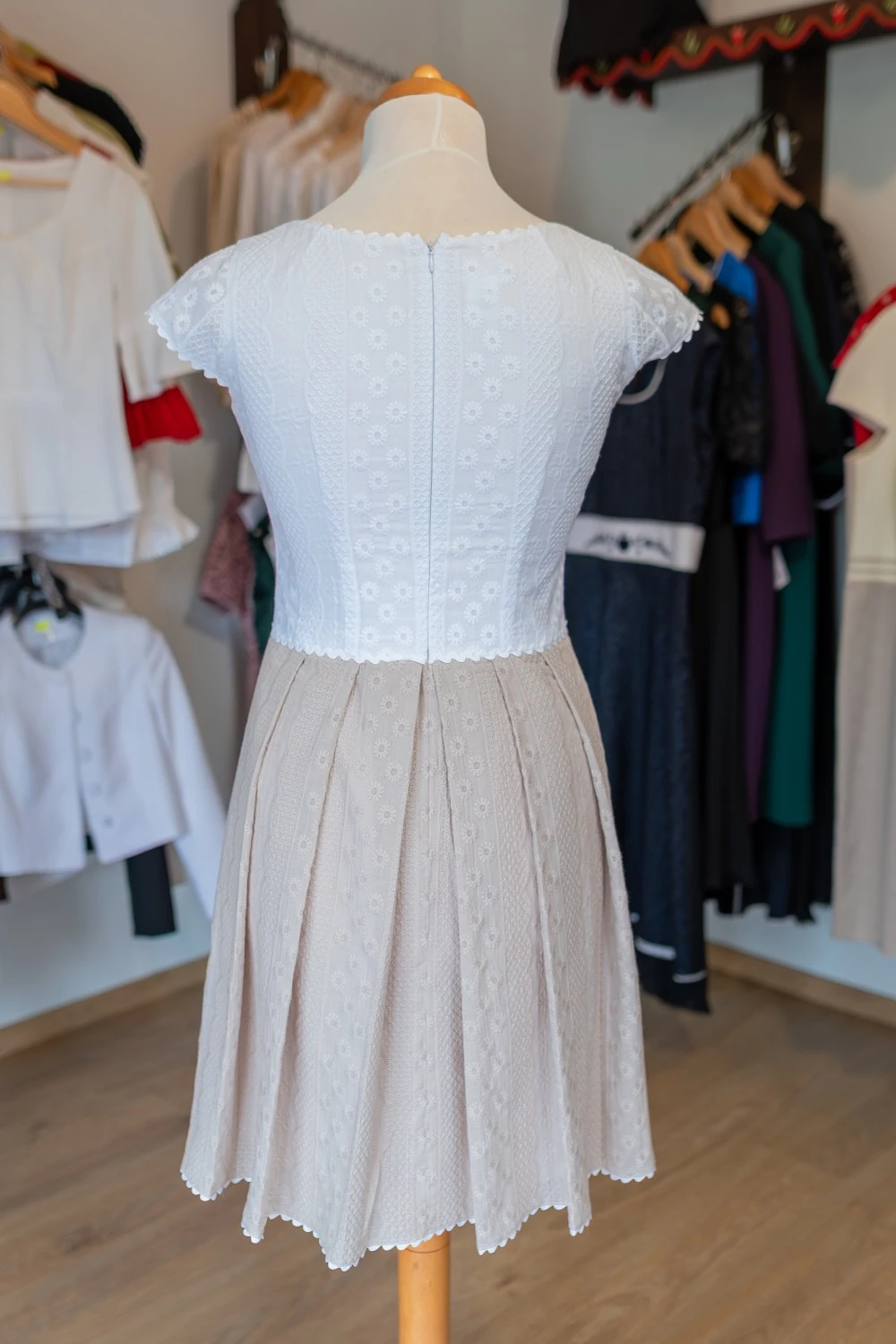A ruha alsó és felső, illetve a bélés része is természetes anyagból készül. A madeira csipke lágy bája teszi egy igazán jellegzetes Erzsó darabbá.