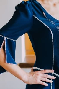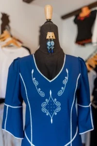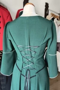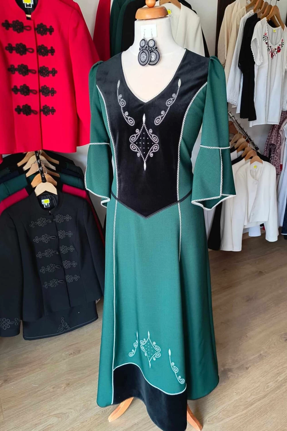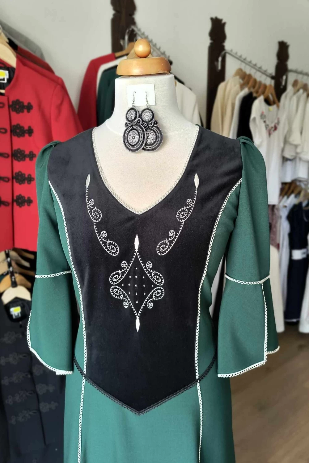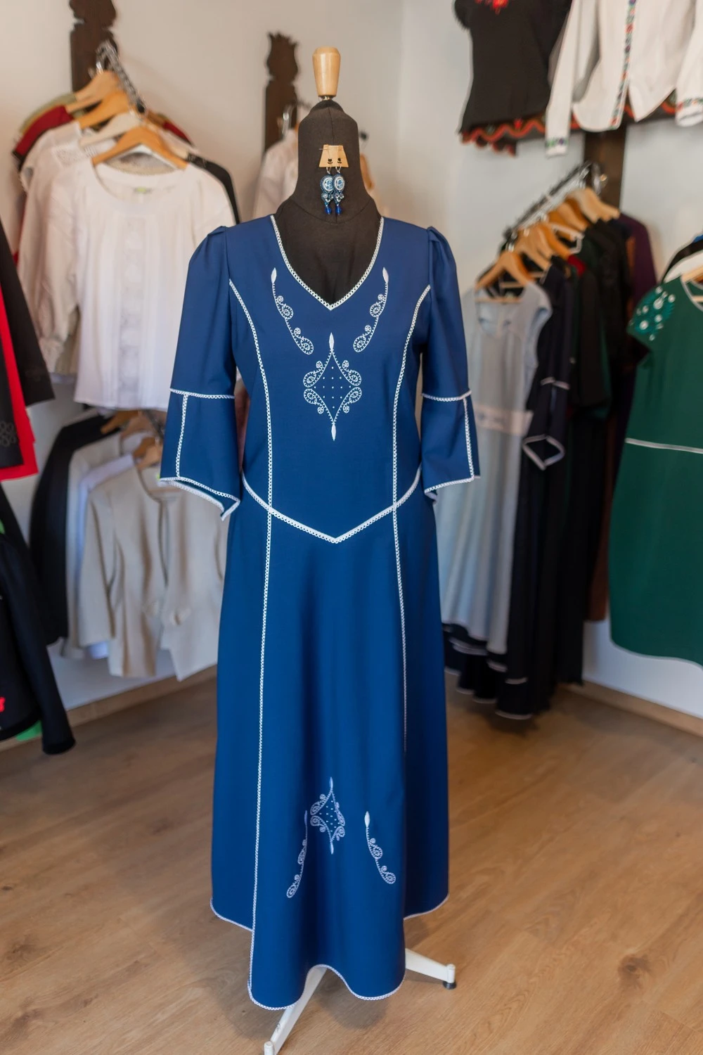Az Erika ruhamodell egy igazán különleges, vásárlóink által „nagyasszonyos” ruhának nevezett darab. Tény és való, hogy aki felveszi, tekintély parancsolóan rögtön kihúzza magát benne. A mell- és szoknyarészét polgári hímzés díszíti, hátát fűzős megoldás teszi hosszú ideig hordhatóvá (enyhe hízás/fogyás esetén is). Anyaga lágy esésű poliészter-viszkóz keverék, mely tartást ad a ruhának.