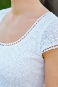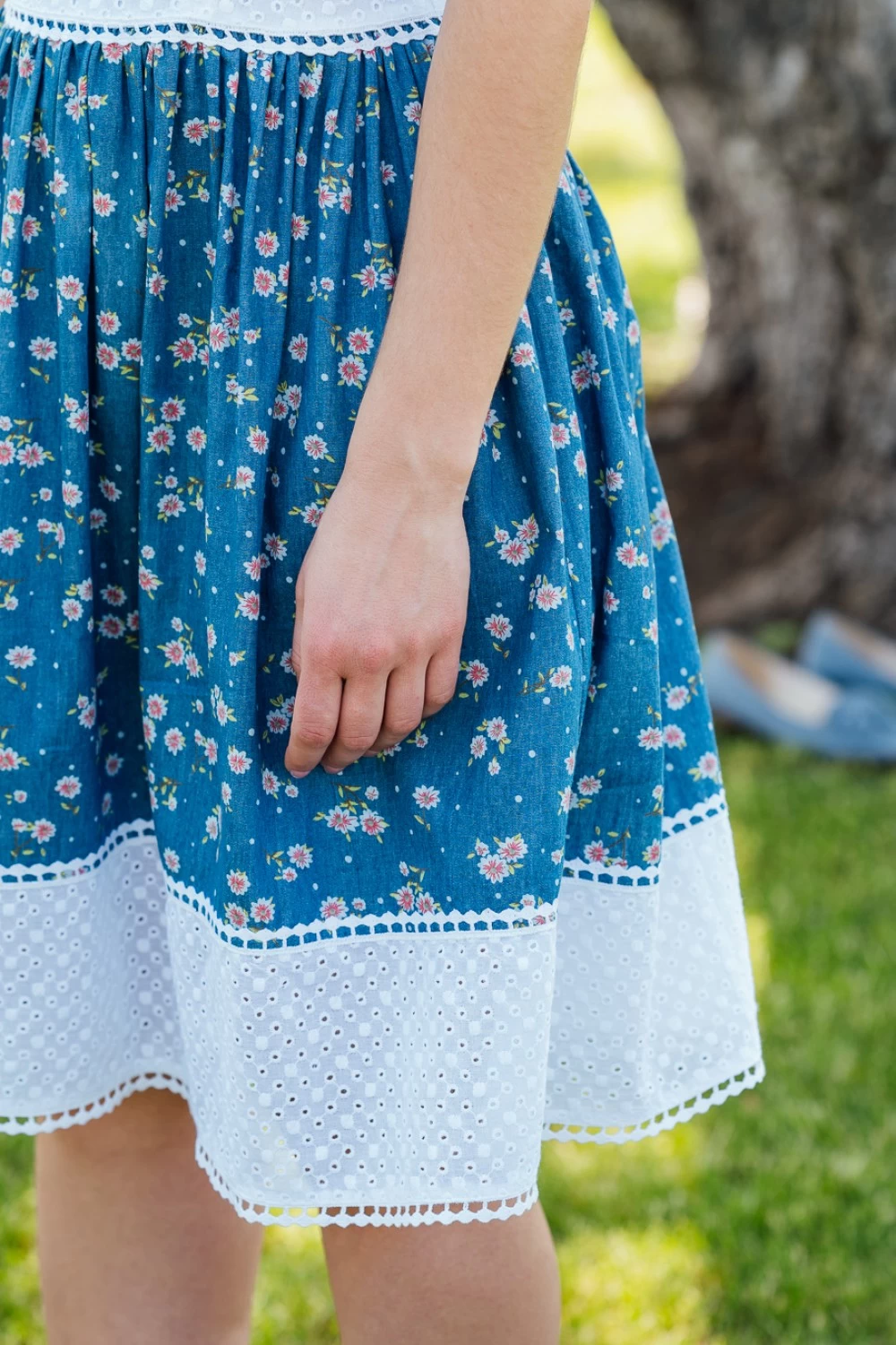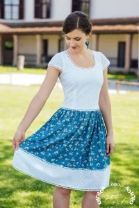 Az Izabella ruha korábban csíkos szoknyarészét könnyed farmer anyagra váltottuk, melynek apró virágmintái harmonikusan kiegészítik a csipkézett madeira részt.