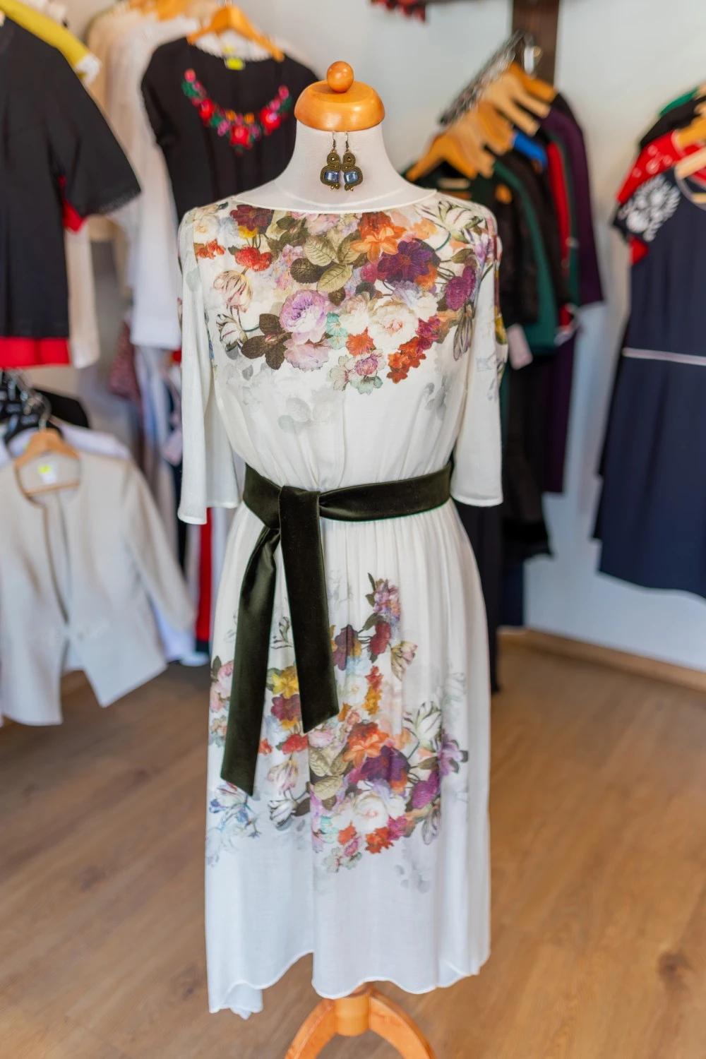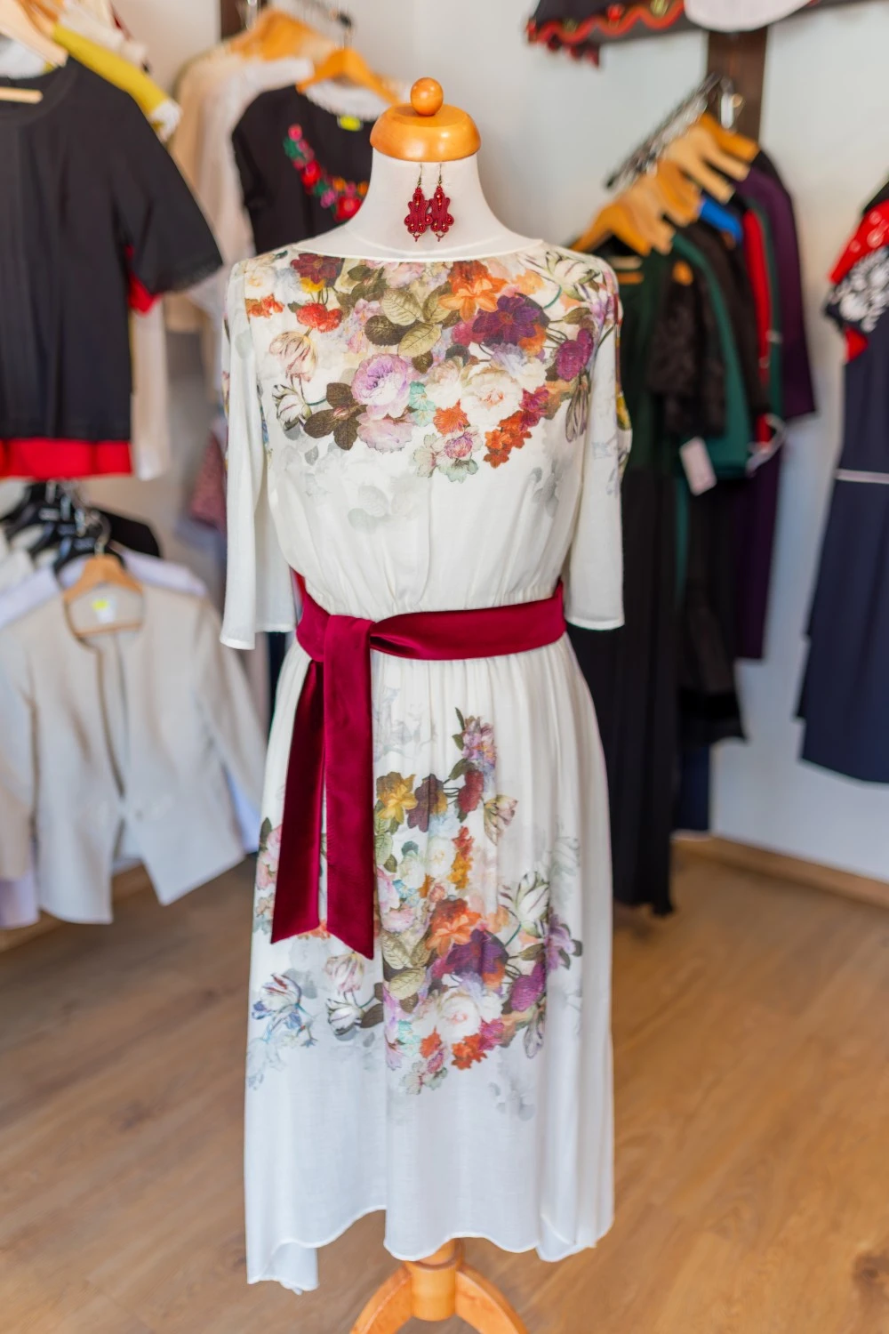 Ez a gyönyörű rózsa mintás ruha selyem és len finom szövésű anyagából készült, amely könnyed és kellemes viseletet biztosít. A bélés gondoskodik a tökéletes tartásról és komfortérzetről, míg a gumírozott derékrész nőies vonalat kölcsönöz. A bársony öv bordó vagy zöld színben választható, így mindig az alkalomhoz és a hangulathoz igazítható. Ez a ruha tökéletes választás ünnepi eseményekre, nyári rendezvényekre, de akár a mindennapok elegáns öltözeteként is megállja a helyét.