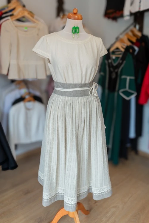 • - egy lágyesésű, loknis szoknyarész minőségi selyemből, viszkóz béléssel, hozzáilló türkörbársony övvel;
