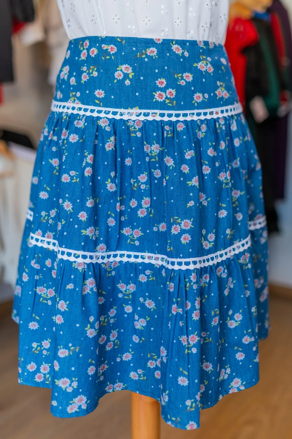 Ez a virágmintás, vékony farmer anyagból készült szoknya könnyed és kényelmes viselet a melegebb napokra. A klasszikus kék alapon apró virágminták fiatalos megjelenést kölcsönöznek, a fehér csipkeszegélyek pedig játékos, nőies részletként díszítik a darabot.
