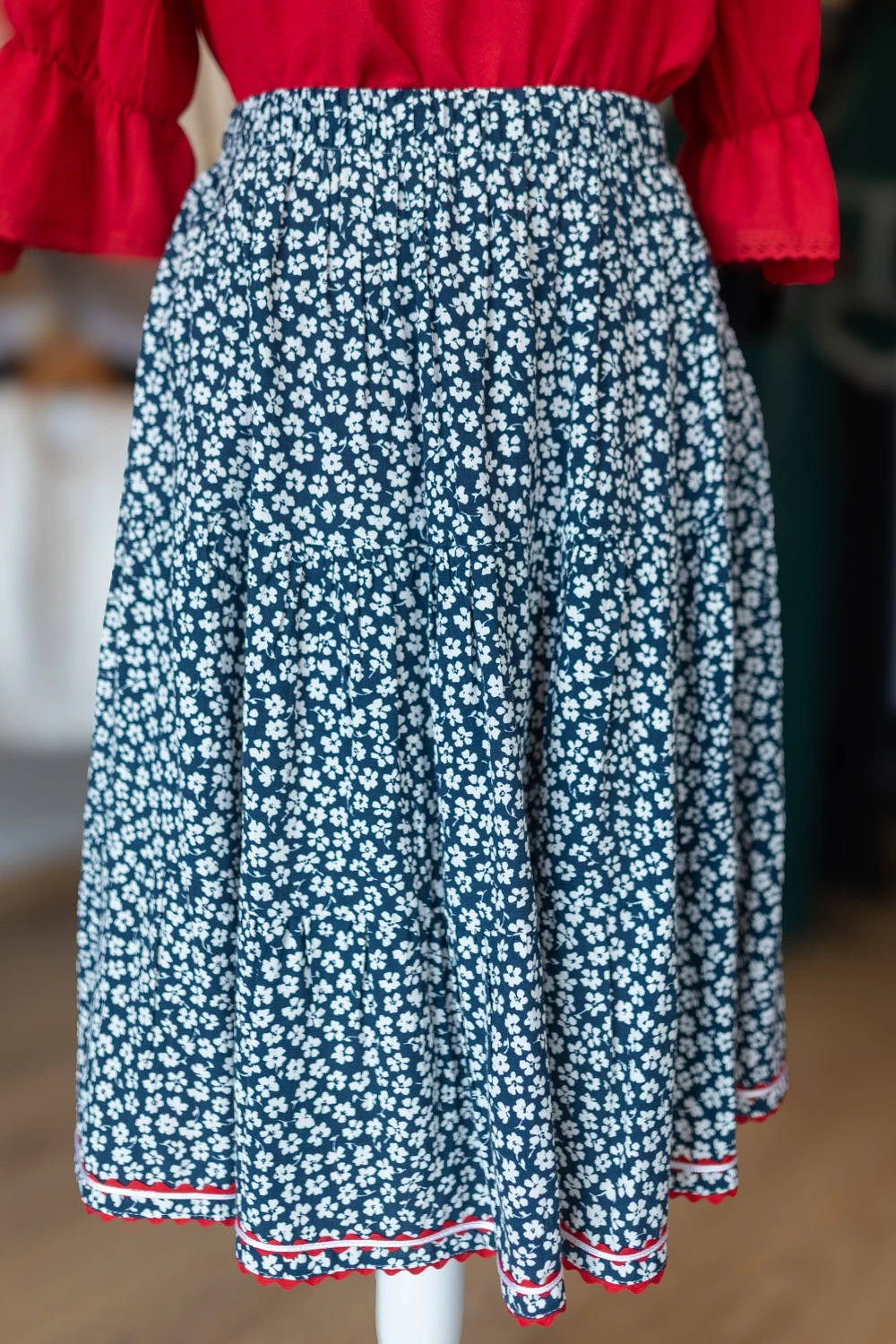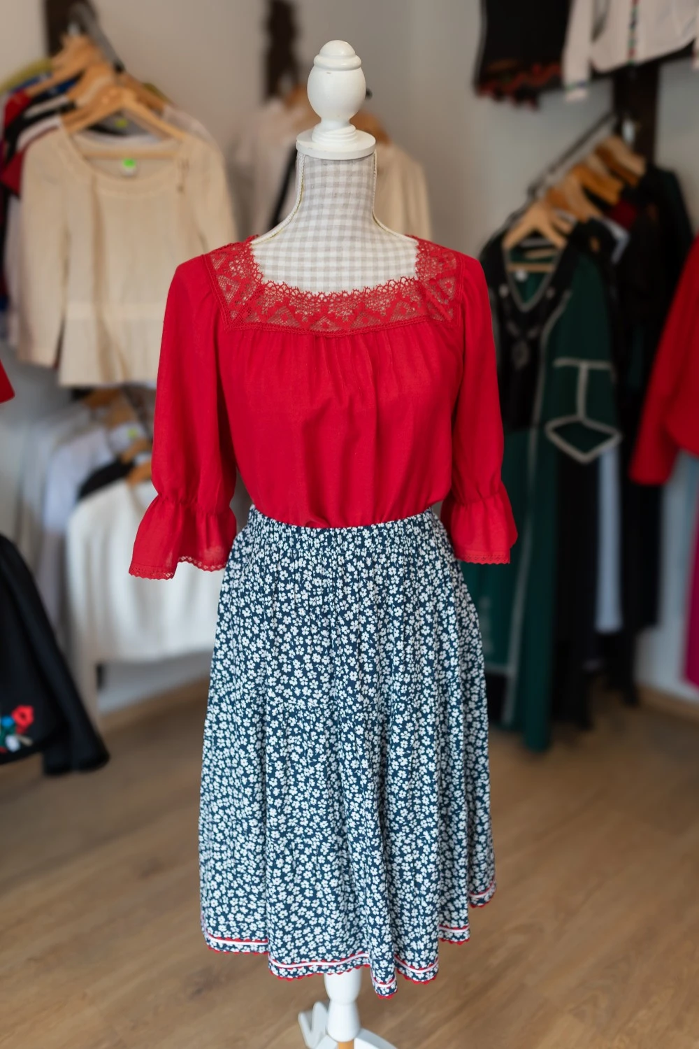 Ez a pörgős nyári szoknya igazi frissítő darab a meleg napokra. Könnyed, légáteresztő, virágmintás anyagának köszönhetően kellemes viselet a mindennapokban. Rugalmas dereka gondoskodik a kényelmes illeszkedésről, míg az alsó szegélyt díszítő piros csipke játékos, vidám karaktert ad a megjelenésnek. Tökéletes választás városi sétákhoz, nyári programokhoz vagy akár hagyományosabb összeállításokhoz is.