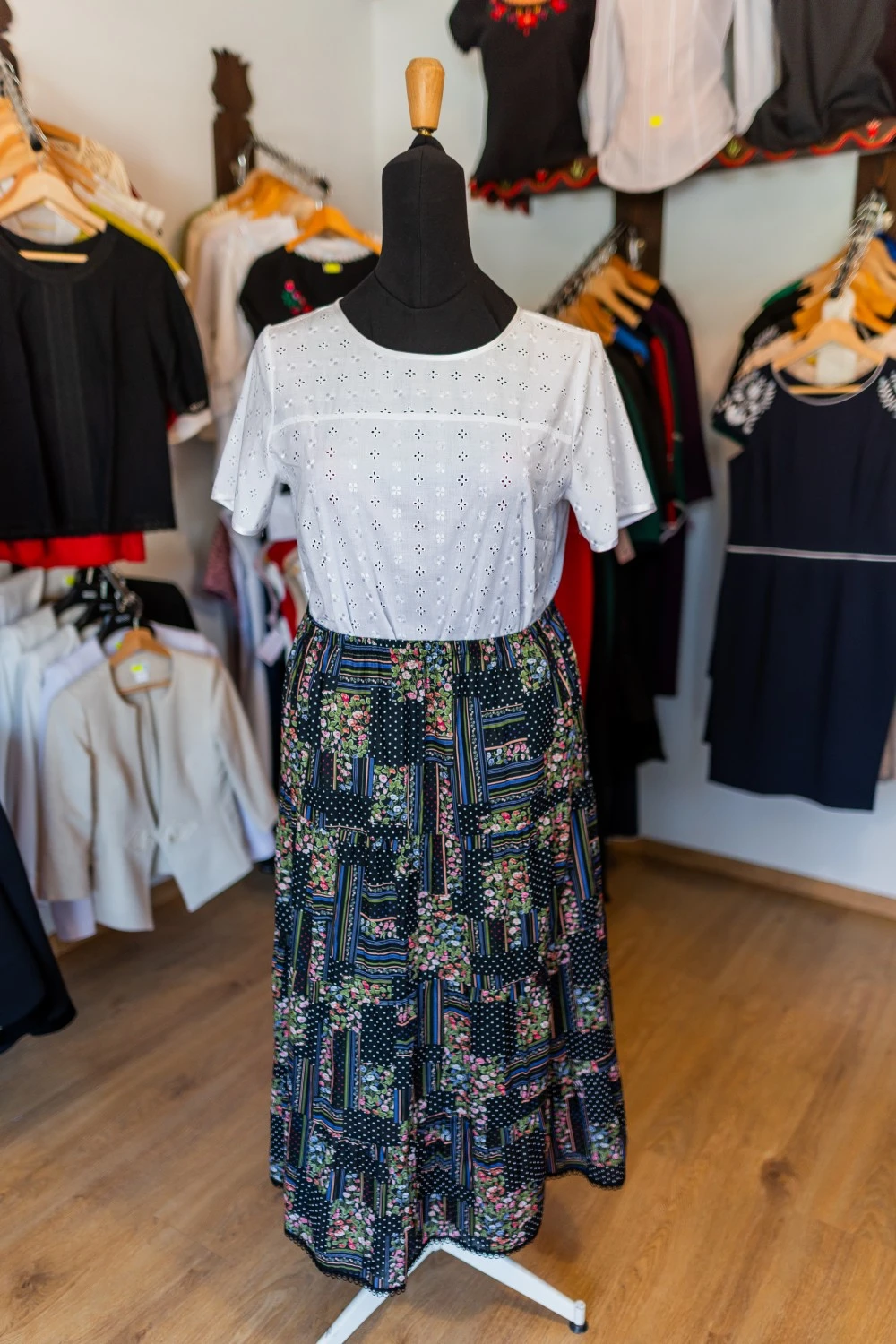 Ez a vidám, tarkamintás szoknya könnyed és légies gyűrt pamut batiszt anyagból készült, amely kellemes viselet a melegebb napokon is. A mintázatban virágok, pöttyök és csíkok váltják egymást, így a darab egyszerre játékos és elegáns.