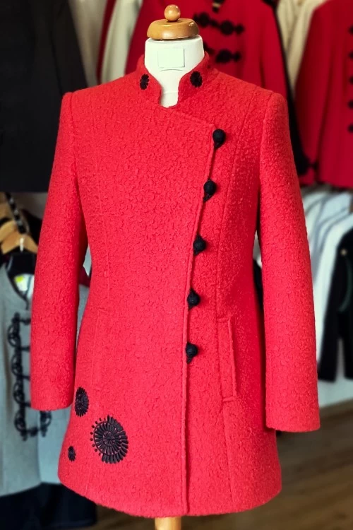 Az Emese kabát könnyű gyapjúposztóból készült, így elegáns és kényelmes viselet a hűvösebb napokra. Különlegességét a mintás, nemezelt anyag adja, amely egyedi megjelenést kölcsönöz neki. A kabát gombolása és szabása nőies, karcsúsított vonalakat hangsúlyoz. Sokféleképpen hordható, a változtatható gallérja miatt alkalmi és hétköznapi összeállításokhoz is remekül illik.