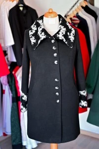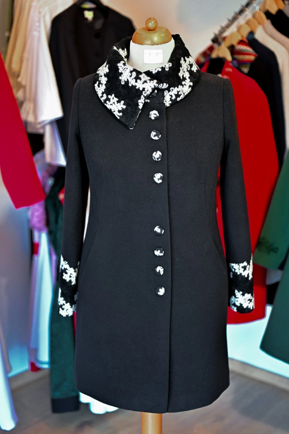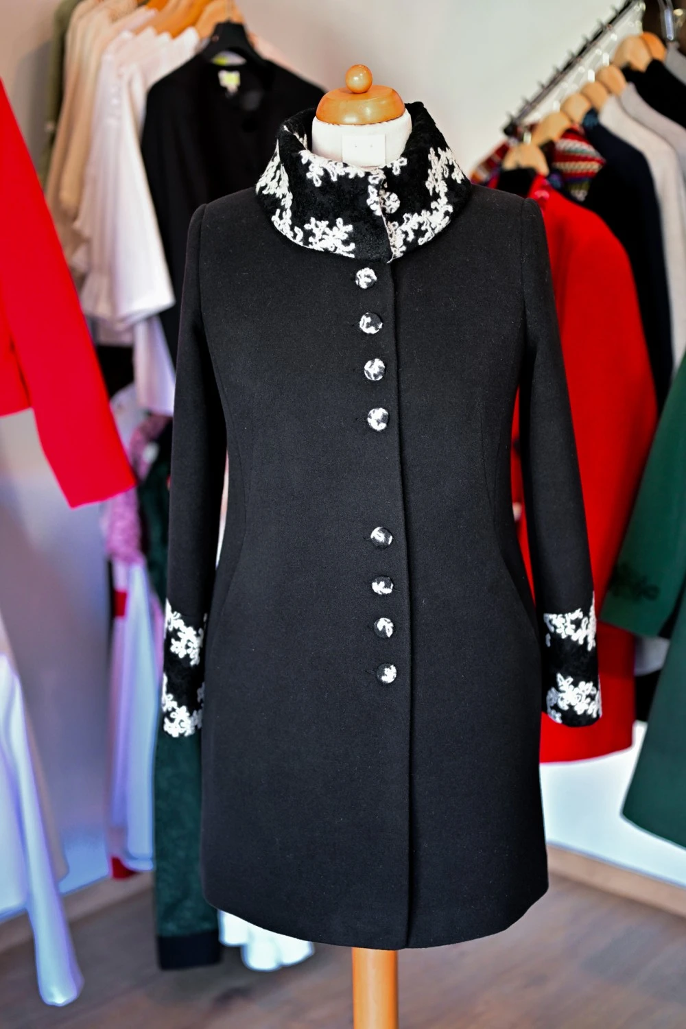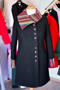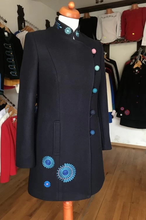 Az Emese kabát könnyű gyapjúposztóból készült, így elegáns és kényelmes viselet a hűvösebb napokra. Különlegességét a mintás, nemezelt anyag adja, amely egyedi megjelenést kölcsönöz neki. A kabát gombolása és szabása nőies, karcsúsított vonalakat hangsúlyoz. Sokféleképpen hordható, a változtatható gallérja miatt alkalmi és hétköznapi összeállításokhoz is remekül illik.