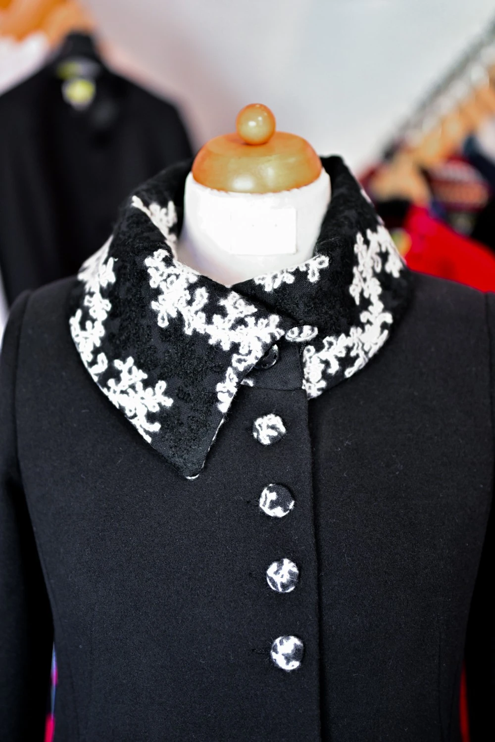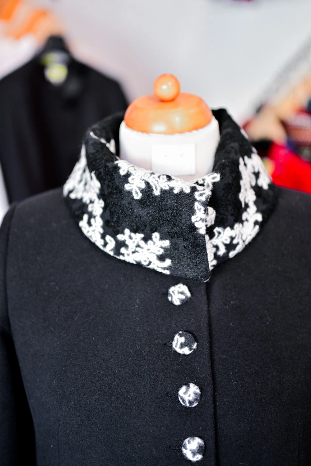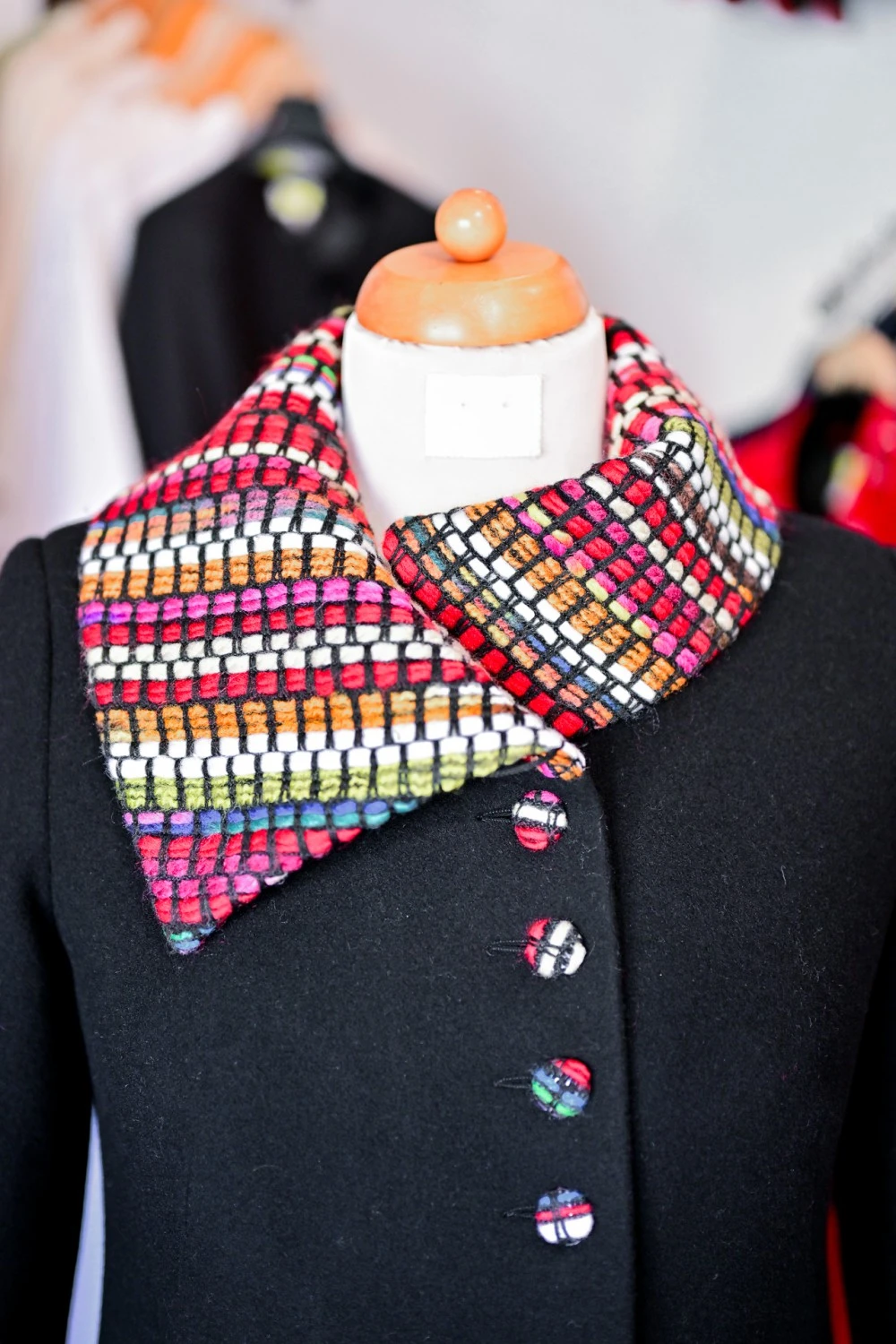 Az Emese kabát könnyű gyapjúposztóból készült, így elegáns és kényelmes viselet a hűvösebb napokra. Különlegességét a mintás, nemezelt anyag adja, amely egyedi megjelenést kölcsönöz neki. A kabát gombolása és szabása nőies, karcsúsított vonalakat hangsúlyoz. Sokféleképpen hordható, a változtatható gallérja miatt alkalmi és hétköznapi összeállításokhoz is remekül illik.