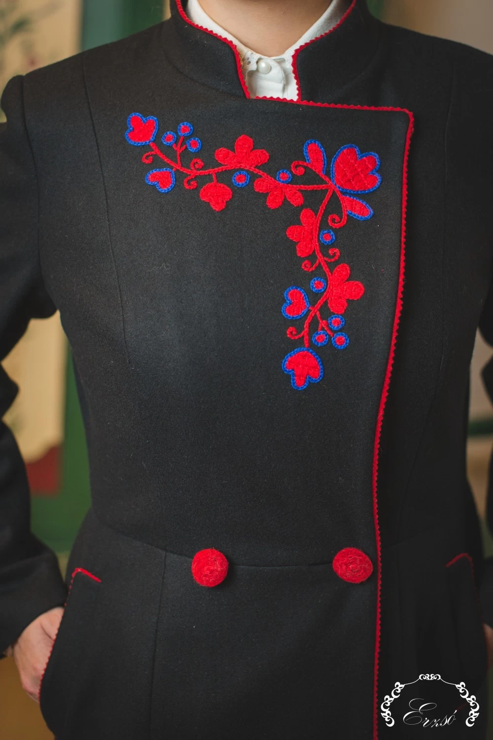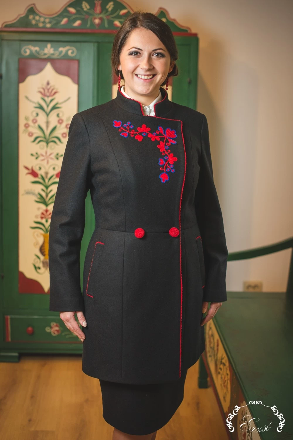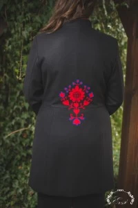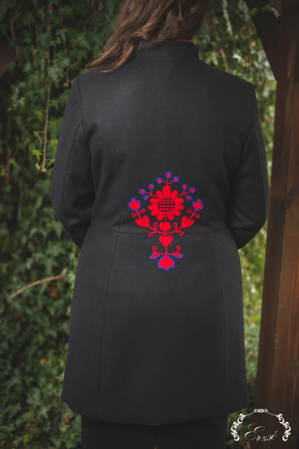 The coat embroidered with the Udvarhelyszék pattern is a really special piece. The overlapping front, the slim-fitting cut and the blue and red embroidery pattern make the jacket unique and timeless in its simplicity. The jacket is finished with a quilted lining.
