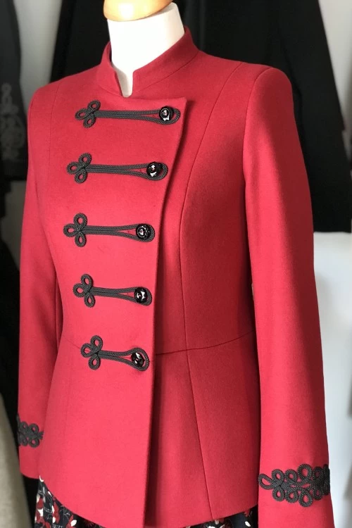The Zsuzsika blazer was originally made to match the Zsuzsika dress, but it is also a great companion to the Annabella dress, or to any other dress with a cut-off waist. Made of a viscose-polyester, it can be worn in all seasons. The neckline is trimmed with fine lace and the buttons are decorated with diamond-shaped embroidery.